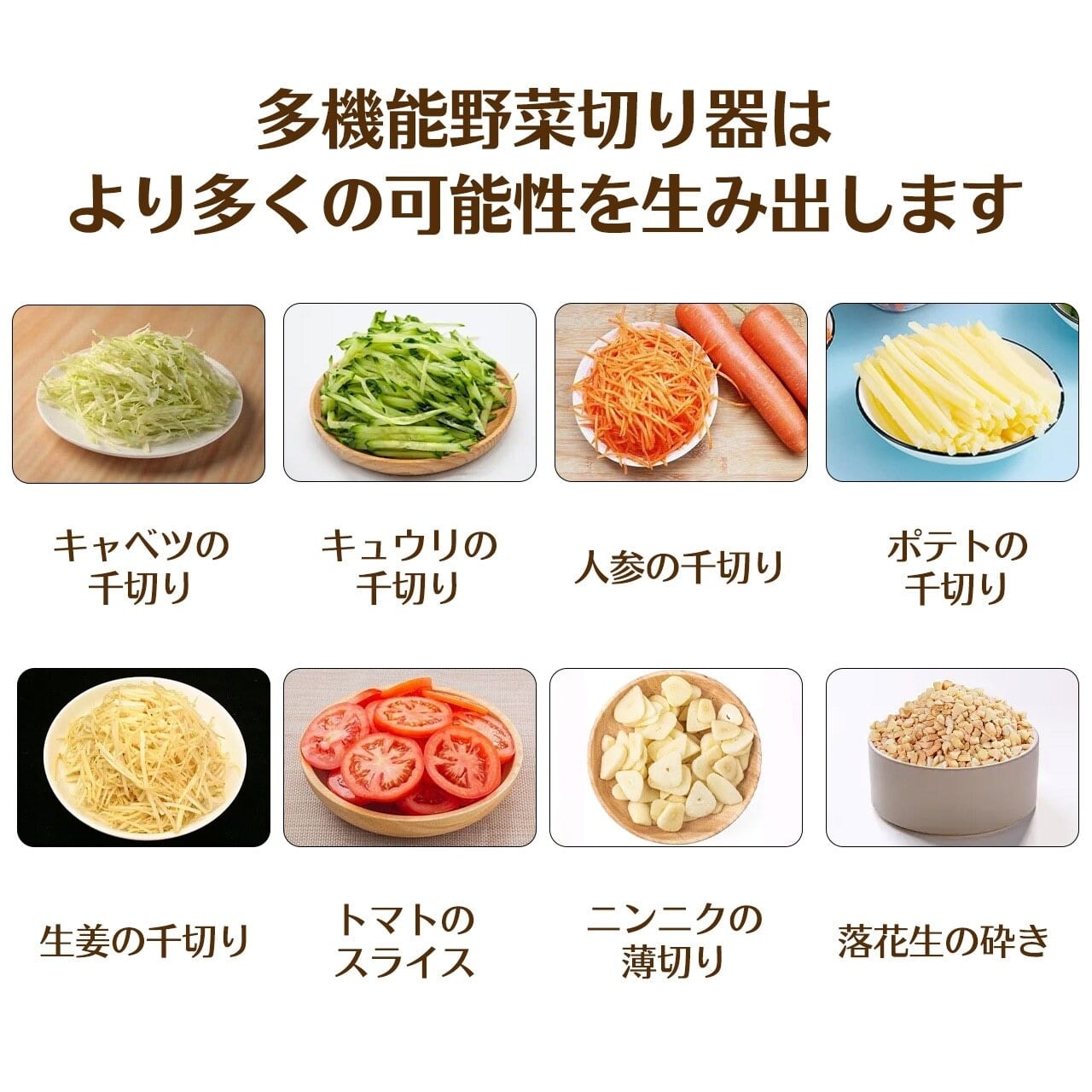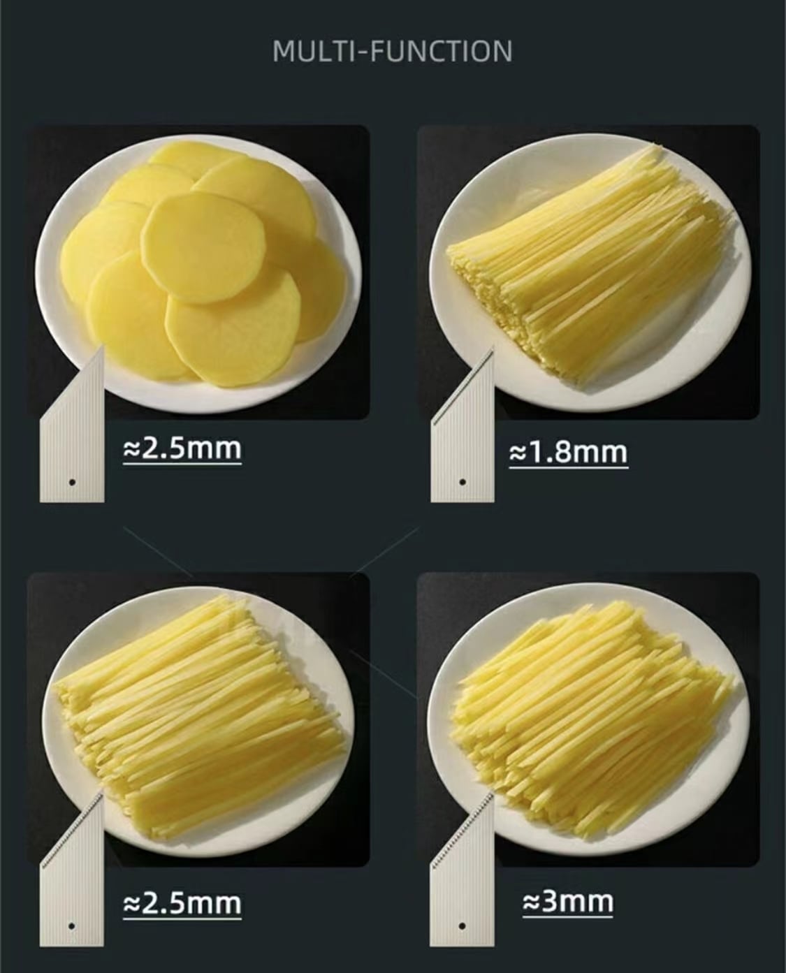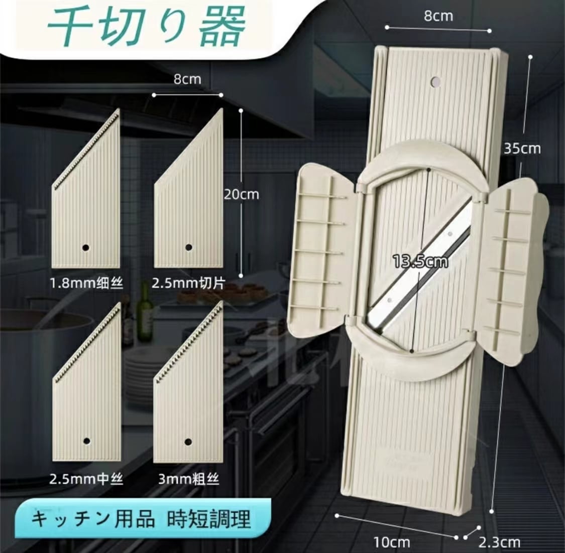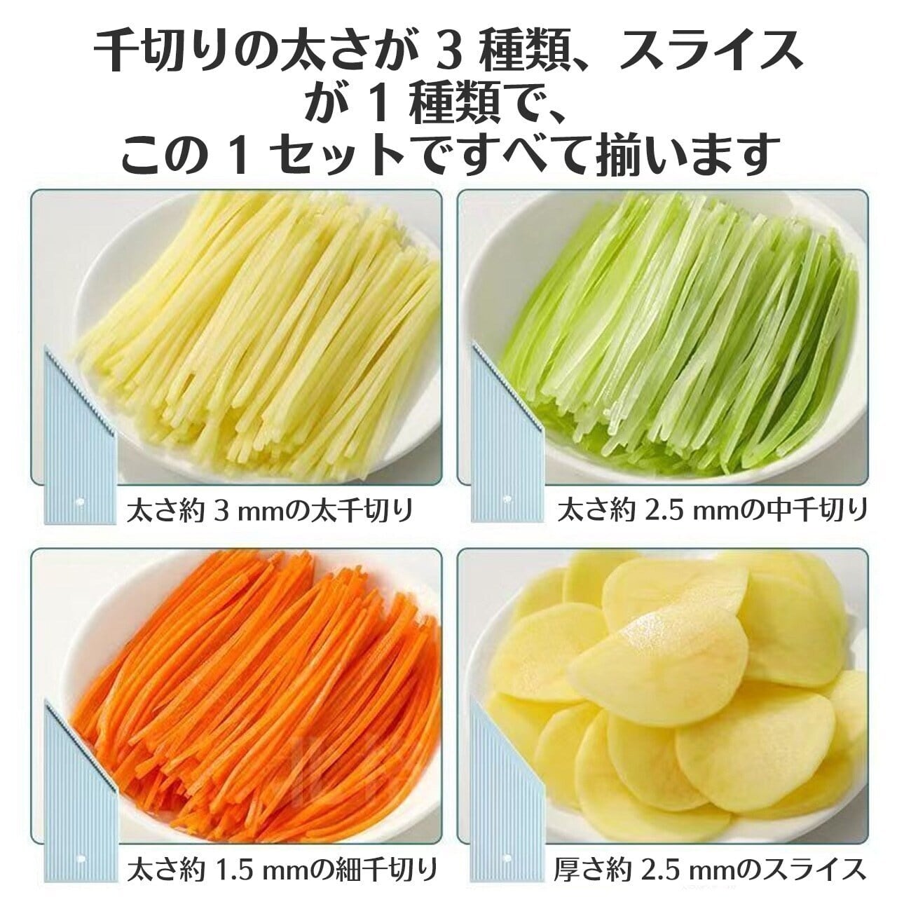 セット:細千切り(1.8mm)+中千切り(2.5mm)+太千切り(3mm)+スライス(2.5mm)