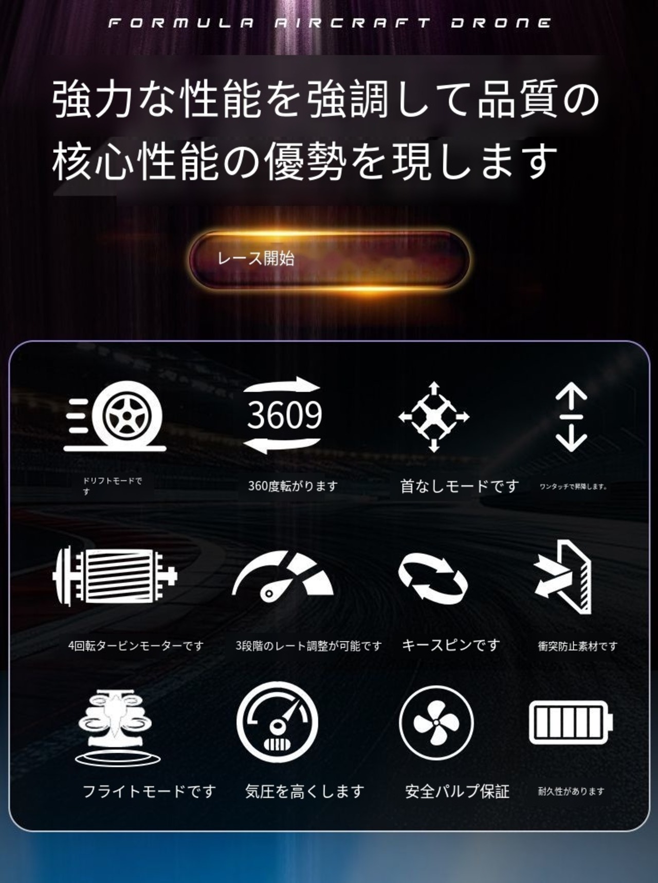 内蔵マルチカラー・カラフルライトは、飛行時と走行時に同期点灯し、夜間点灯時の視覚効果がMAXになり、クールさが倍増して全场の注目を集める。安全な耐衝撃素材で製造され、機体は耐衝撃・耐衝突性に優れ、お子様の遊び中の意外な落下や衝突に対応し、使用寿命を延長;充電式バッテリーを装備し、充電が簡便で持続時間が長く、頻繁に電池交換する必要がなく、思いっきり遊びを楽しめる。