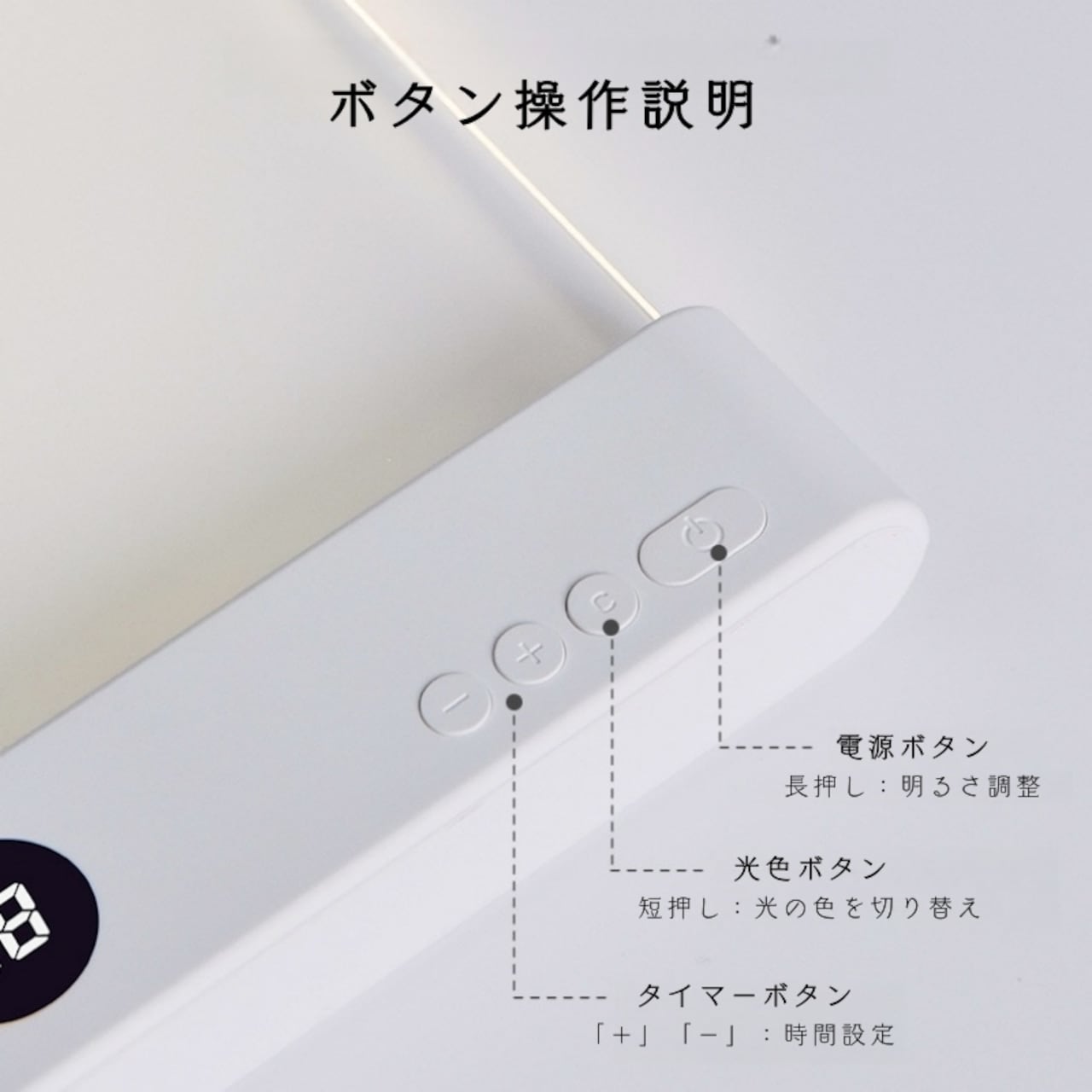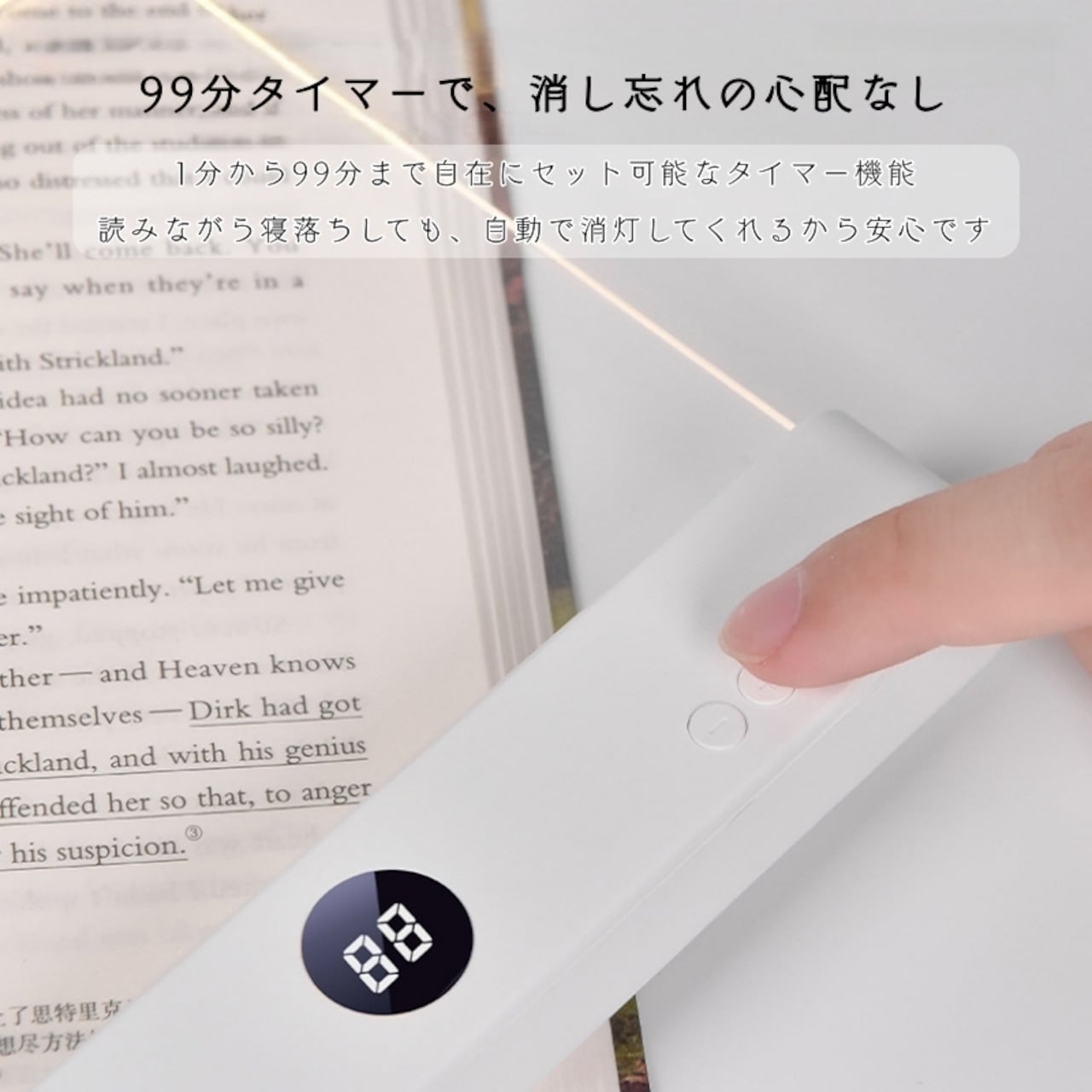 1分〜99分の範囲でカウントダウンタイマーを設定可能。時間になると自動消灯するので、読書中の寝落ちや、お子様の就寝時の見守りライトとしても最適です。