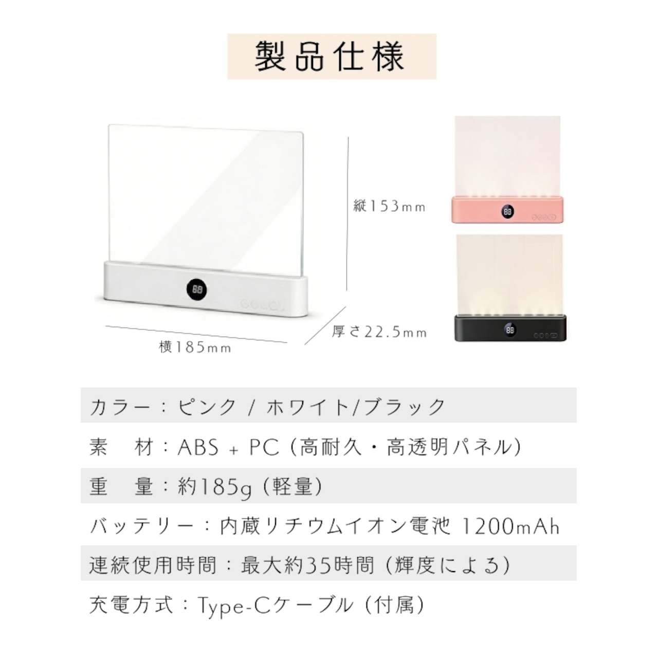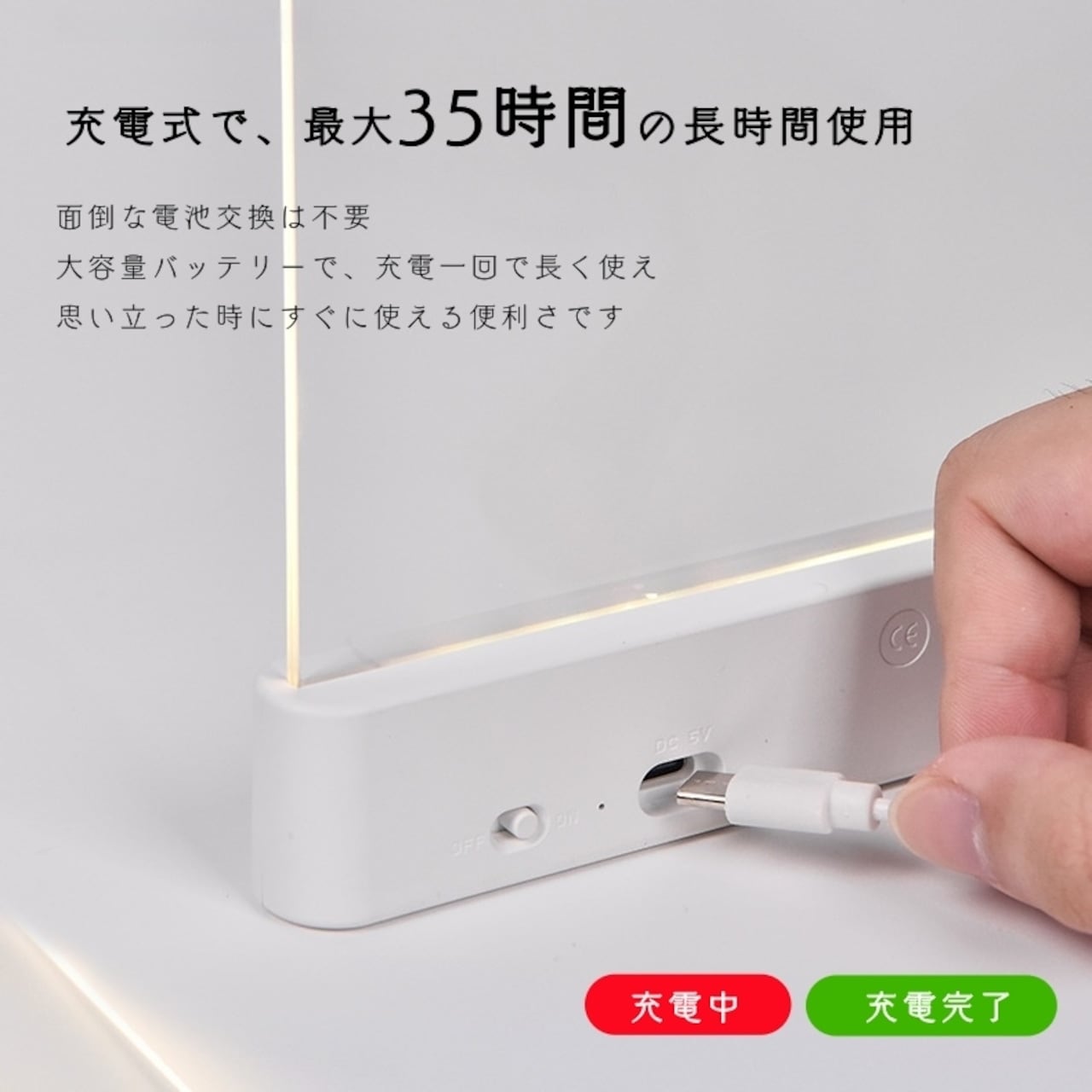 大容量1200mAhバッテリーを内蔵。最大輝度で約10時間、最低輝度なら最大約35時間の連続使用が可能です。面倒な電池交換は不要。付属Type-Cケーブルで簡単充電。