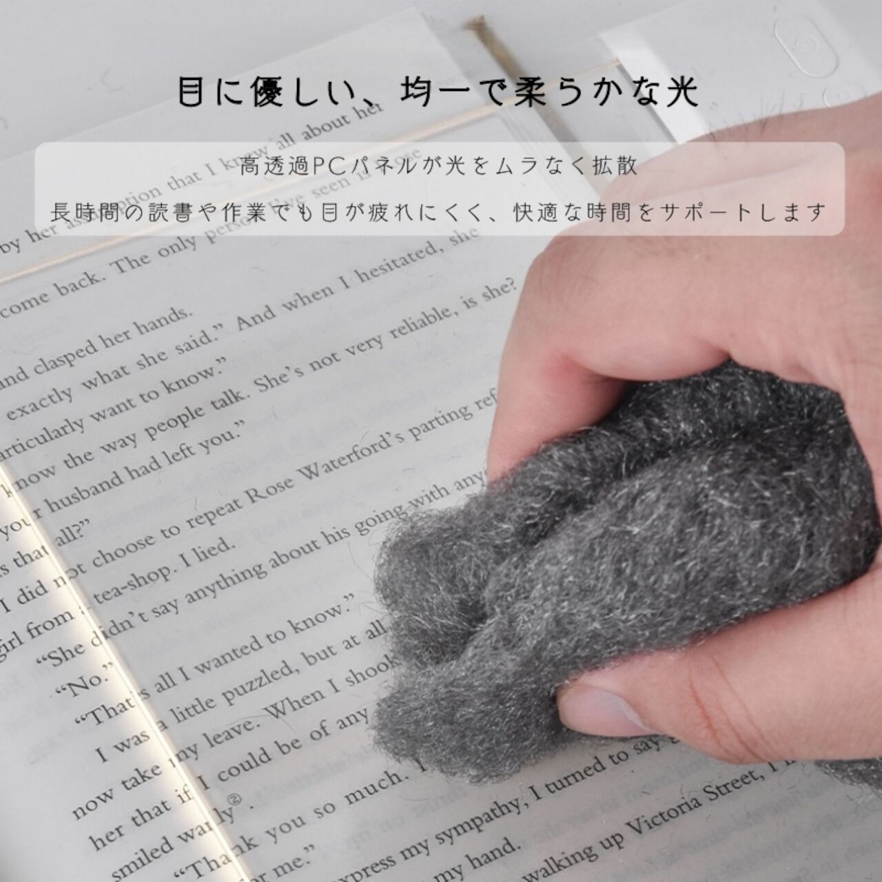 高品質PC素材を使用した透明パネルは、傷に強く、光を柔らかく拡散。クリアでムラのない光が、長時間の読書や作業でも目の疲れを軽減します。